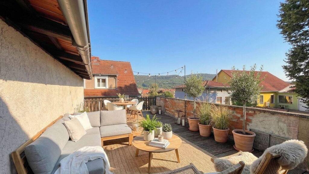 Ein besonderes Highlight der Immobilie ist die großzügige Terrasse über der Garage. Von hier aus genießen Sie einen sensationellen Weitblick über Falken und die umliegende bewaldete Hügellandschaft. Die Terrasse bietet reichlich Platz für Freunde und Familie und lädt zu entspannten Stunden sowie gemütlichen Grillabenden ein.