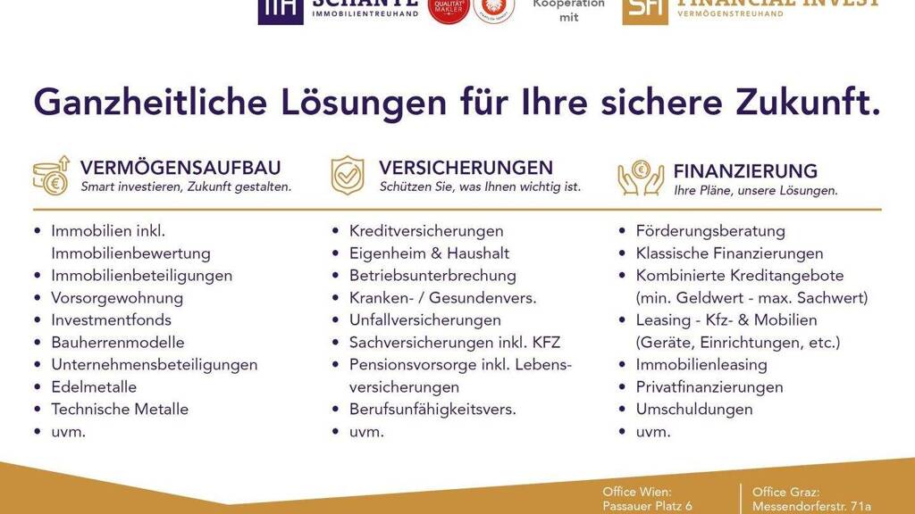 In Kooperation mit unserer SFI Vermögenstreuhand begleiten wir Sie bei der Verwirklichung Ihres Traumobjekts und unterstützen Sie beim nachhaltigen Vermögensaufbau.