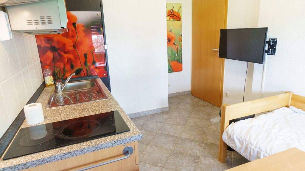 Tolles, komplett möbliertes Gästezimmer in Filderstadt, Ortsteil Bonlanden. Das Zimmer ist in einem Einfamilienhaus im 1. Stock. Das Zimmer hat Fussbodenheizung, einen gemütlichen Essbereich mit Eckbank und eine eigene komplett ausgestattet und löffelfertig Küchenzeile (mit 2 Herdplatten, Microwelle, Kühlschrank, Kaffeepadmaschine, Wasserkocher, Toaster, Eierkocher, Spülbecken).