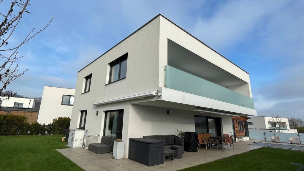 Diese neuwertige und hochwertig ausgestattete Villa wurde ca. im Jahr 2020 errichtet, erstreckt sich über 190 m2 Wohnfläche und bietet einen optimalen Grundriss auf zwei Ebenen. Im Erdgeschoss kommen Sie über einen einladenden Eingangsbereich direkt in den großzügigen Wohn-Essbereich, bestehend aus einer komplett ausgestatteten exklusiven Küche (DAN-Küche), der perfekt für gesellige Zusammenkünfte geeignet ist. Ein weiterer großer Wohnraum, ein Technikraum, WC und 2 Abstellräume vervollständigen dieses Stockwerk.