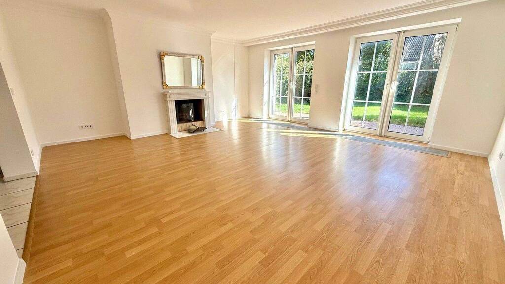 Das offene und lichtdurchflutete Wohnzimmer beeindruckt durch seine weitläufige Raumwirkung, bodentiefe Fenster und einem stilvollen Kaminbereich, der für besondere Abende und Wohnmomente sorgt. Direkt vom Wohnzimmer finden Sie Zugang zum wunderschön angelegten Garten mit einem gepflasterten Terrassenbereich. Ein Ort für Ruhe, Familienleben und entspannte Sommerabende. Die abgetrennte Küche mit Bartheke verbindet sich harmonisch mit dem Essbereich - perfekt für kommunikatives Kochen und gesellige Abende. Ein Gäste-WC rundet das Erdgeschoss ab.