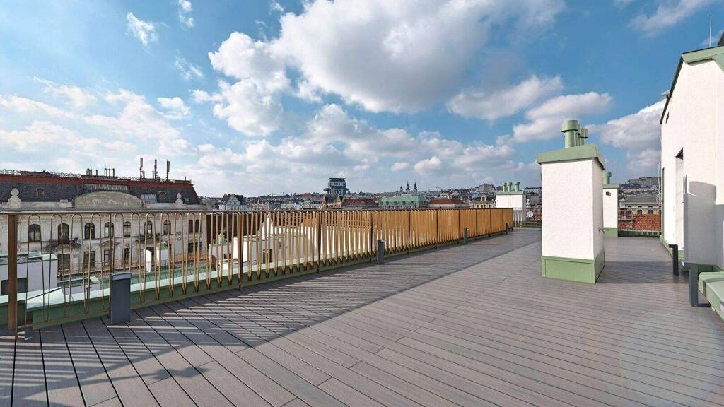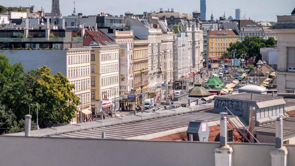 Dieses einzigartige Penthouse mit Privatsphäre befindet sich auf einer Ebene und verfügt über ca. 171 qm Wohnfläche sowie 3 Terrassen im Ausmaß von insgesamt ca. 178 qm - zwei davon auf der Wohnebene und eine grandiose Dachterrasse mit Blick über den Naschmarkt.