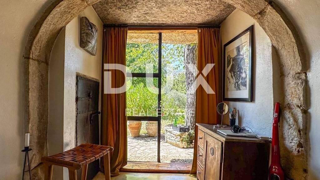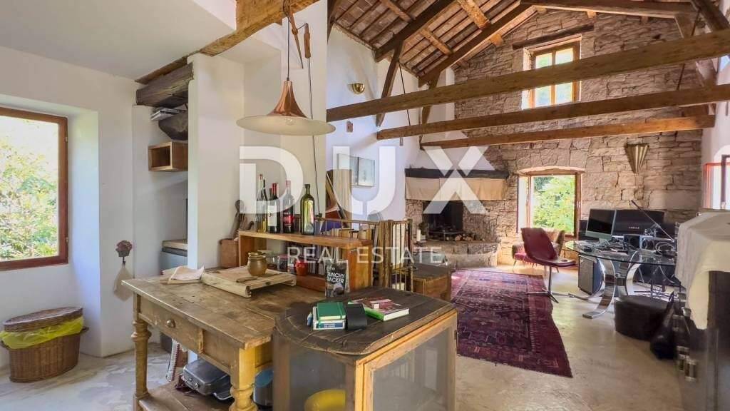 Zum Verkauf steht ein einzigartiges und authentisches Anwesen im Herzen Istriens mit 6 Steinhäusern in einer etablierten Touristenvermietung. Alle Häuser sind aus Stein und authentisch, aus alten Materialien gebaut und kombinieren altes Holz (mit sichtbaren Balken und Fliesen) und modernen Elementen. Jedes Detail strahlt einen künstlerischen Geist aus und vermittelt das Gefühl, in einer alten, magischen Zeit zu sein. Auf dem großen Baugrundstück von 5800 m2 befindet sich außerdem ein nicht einsehbares Naturschwimmbad. Der große Garten bietet zahlreiche Möglichkeiten zum weiteren Bauen oder zum Genießen unberührter Natur. Das Grundstück ist von Wald umgeben und vollständig vor Blicken geschützt. Das erste freistehende Haus ist von den anderen Häusern getrennt und verfügt über einen Naturpool, eine Sommerküche, eine Terrasse und einen Garten mit Sauna. Es erstreckt sich über 3 Etagen. Im Erdgeschoss gibt es eine Küche, ein Esszimmer, ein Wohnzimmer mit Kamin, ein Schlafzimmer und ein Badezimmer. Im Obergeschoss gibt es eine weitere Küche, ein Wohnzimmer, einen Kamin und eine Treppe, die in die dritte Etage führt, wo sich ein Schlafzimmer befindet. Das zweite Gebäude besteht aus 3 separaten Wohneinheiten mit etablierten touristischen Mietverträgen. Das erste Gebäude ist ein komfortables und geräumiges Steinhaus mit einem Balkon mit Blick auf den Hof und einer privaten hinteren Terrasse, eingebettet in das Blätterdach aus Eichen und Akazien. Das Haus verfügt über eine Küche, einen Kamin und ein Wohnzimmer, zwei Badezimmer mit Duschen und ein gemütliches Doppelzimmer im Erdgeschoss. Im ersten Stock gibt es ein Kingsize-Bett in einem offenen Raum mit französischen Türen, die auf beiden Seiten zu einem Balkon führen, ein kleineres Zimmer mit zwei antiken Walnussbetten und ein Badezimmer. Das zweite Gebäude verfügt im Erdgeschoss über eine Küche und ein Wohnzimmer sowie Terrassen auf beiden Seiten des Hauses. Das Schlafzimmer und das Badezimmer befinden sich im ersten Stock und haben Zugang zum Balkon. Das dritte Objekt ist ein komfortables und geräumiges Steinhaus mit Balkon und Blick auf den Garten. Das Haus verfügt über eine Küche, einen Kamin und ein Wohnzimmer, zwei Badezimmer mit Duschen und ein gemütliches Doppelzimmer im Erdgeschoss. Im ersten Stock gibt es ein Kingsize-Bett und ein Einzelbett in einem offenen Raum mit französischen Türen, die zu einem Balkon und einem Schlafzimmer mit Doppelbett führen. Es gibt auch einen Kazun. Kazunis waren traditionell Trockenmauerhütten, die noch heute in istrischen Dörfern zu sehen sind. Schwerarbeiter und Hirten nutzten sie als Unterschlupf oder als Werkzeug. Dieses Kazun ist als Studio-Apartment eingerichtet. Außerdem gibt es einen Kamin für kühle Herbstabende, eine kleine Küche und ein Badezimmer mit Dusche und einem Bett. Dort gibt es ein weiteres Steinhaus, das ein geselliger und kulinarischer Treffpunkt ist, ein Gemeinschaftsraum inmitten von Akazien und Eichen. Es verfügt über ein geräumiges Wohnzimmer, eine große Küche, einen Kamin und einen Ausgang zur Terrasse, wo ein großer Tisch mit Stühlen steht. Dieses Anwesen ist ideal für die touristische Vermietung oder als Familienparadies. Es steht im völligen Einklang mit Natur und Geschichte.