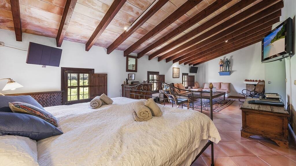 Diese Finca ist ein fantastisches Zuhause, sie besteht aus einem Haupthaus und 3 individuellen G?steh?usern. Im Haupthaus f?hren franz?sische T?ren von der vorderen Terrasse in den Wohnbereich, in dem gem?tliche Sessel um den Kamin groupiert sind. Der Essbereich befindet sich neben der voll ausgestatteten Bauern-K?che. Es gibt ein separates Wohnzimmer mit freiliegenden Steinmauern, von wo aus Treppen in ein Zwischengeschoss mit einem weiteren klimatisierten Sitzbereich f?hren. Auf dieser Ebene gibt es auch ein Schlafzimmer mit einem Einzelbett und ein separates Duschbad.