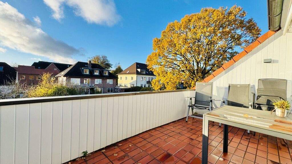 Über das verglaste Treppenhaus, welches bereits einen Schleiblick ermöglicht, gelangt man in die im Dachgeschoss gelegene Wohnung. Die helle Diele bildet den einladenden Auftakt, bietet ausreichend Platz für eine Garderobe und führt Sie weiter in die verschiedenen Wohnbereiche.