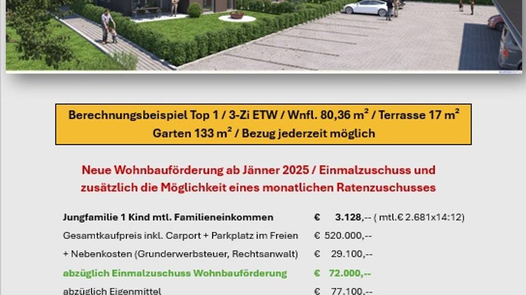 Die Wohnbauförderung als nicht rückzahlbarer Zuschuss des Landes Salzburg kann je nach Familiensituation bis zu € 72.000,-- betragen.