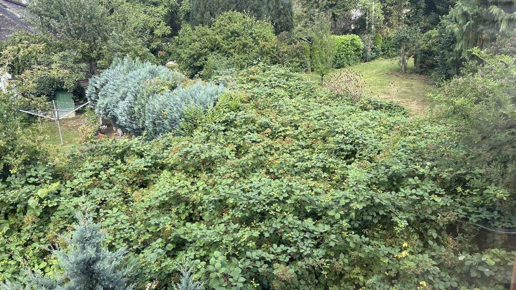 Eine Terrasse mit Zugang zum Garten bietet zusätzliche Aufenthaltsqualität im Freien. Die 1977 errichtete Doppelgarage schafft bequeme Parkmöglichkeiten direkt am Haus. Der Garten bietet großzügige Flächen, ist jedoch aktuell pflegebedürftig und bietet somit Raum für individuelle Gestaltung nach eigenen Vorstellungen.