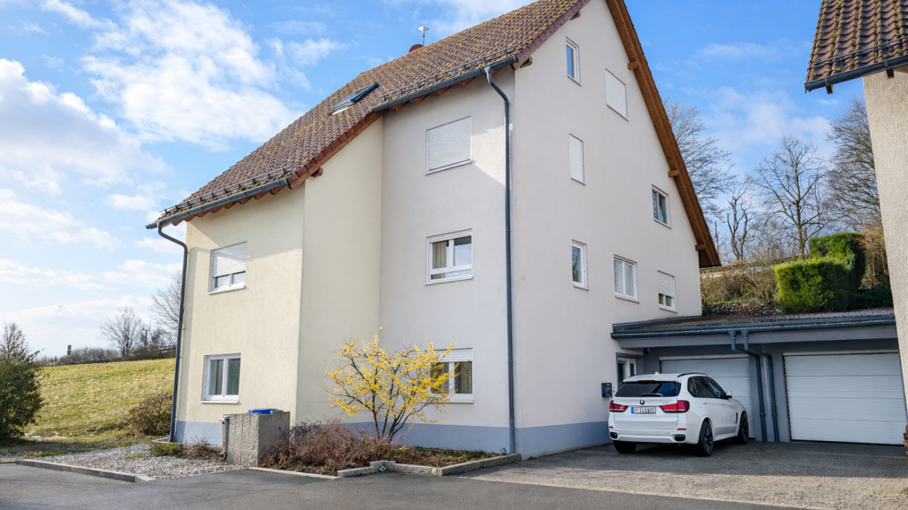 Auf einem ca. 480 m² großen Grundstück bietet das Haus eine beeindruckende Wohnfläche von rund 335 m², verteilt auf insgesamt vier Ebenen mit 8,5 Zimmern. Ergänzt wird das Angebot durch eine großzügige Garage sowie zwei PKW-Stellplätze direkt am Haus, die komfortables Parken für mehrere Fahrzeuge gewährleisten.