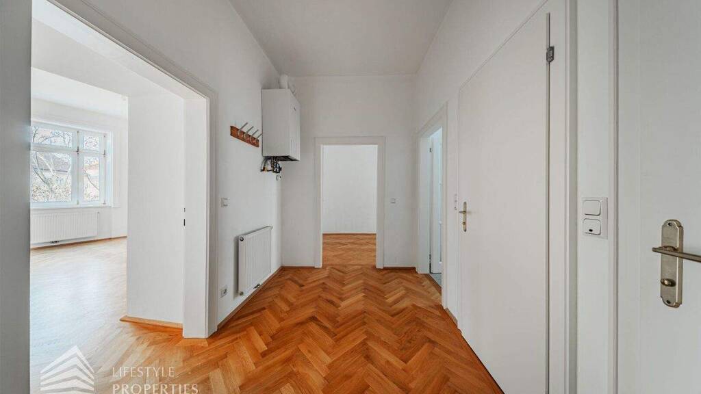 In diesem reizvollen Jugendstilhaus erwartet Sie eine schön sanierte 2-Zimmer Wohnung im 3. Liftgeschoss. Genießen Sie den herrlichen Grünblick, der Ihnen Ruhe und Erholung vom hektischen Stadtleben garantiert. Die Wohnung mit einer Wohnfläche von ca. 54 m², die sich auf einen einen perfekten Grundriss aufteilt, verfügt über eine Raumhöhe von ca. 3,05 m. Das hochwertige Fischgrätparkett erstrahlt nach dem Schleifen wieder in neuem Glanz. Sprossen-Glastüren zur Küche und zum Wohnzimmer lassen Licht durchfluten und unterstreichen den Charakter der Wohnung.