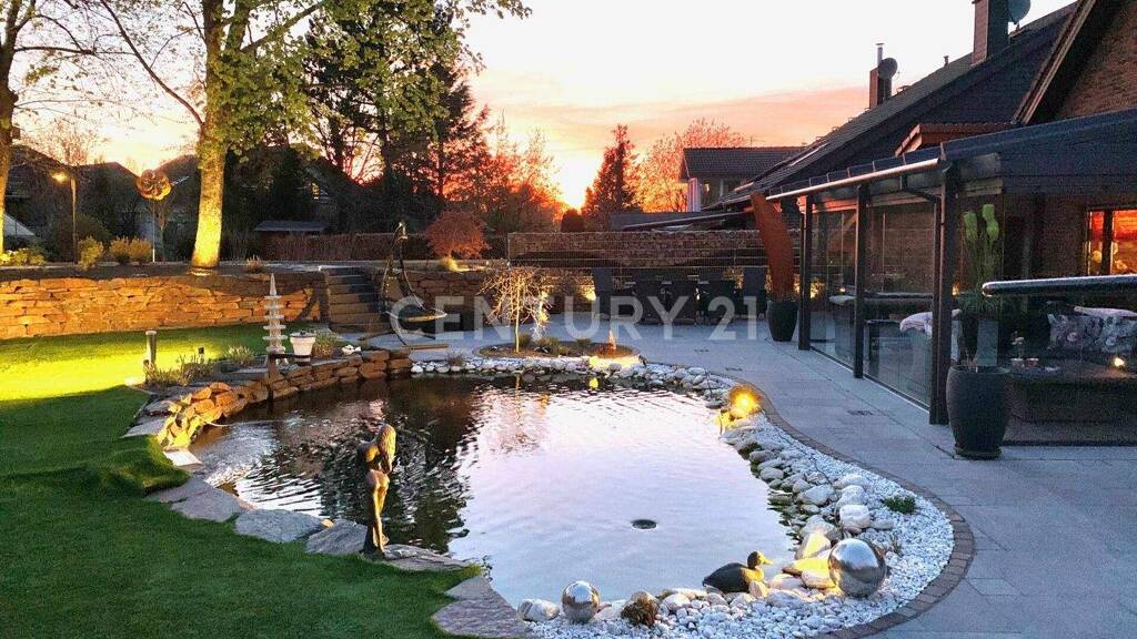 Der Garten, 2017 nach moderaten Feng-Shui-Prinzipien von einer Landschaftsarchitektin gestaltet, ist ein echtes Highlight. Ein großes Glashaus mit Sonnenschutz, ein Koiteich mit beeindruckendem Besatz, eine Gardena-Bewässerungsanlage mit über 100 Wasserstellen sowie stimmungsvolle Außenbeleuchtung schaffen eine einzigartige Wohlfühlatmosphäre - dank Südwest-Ausrichtung zu jeder Jahreszeit. Auch der neu angelegte Vorgarten mit großzügiger Zu- und Abfahrt bietet Platz selbst für ein großes Wohnmobil und ist attraktiv beleuchtet.