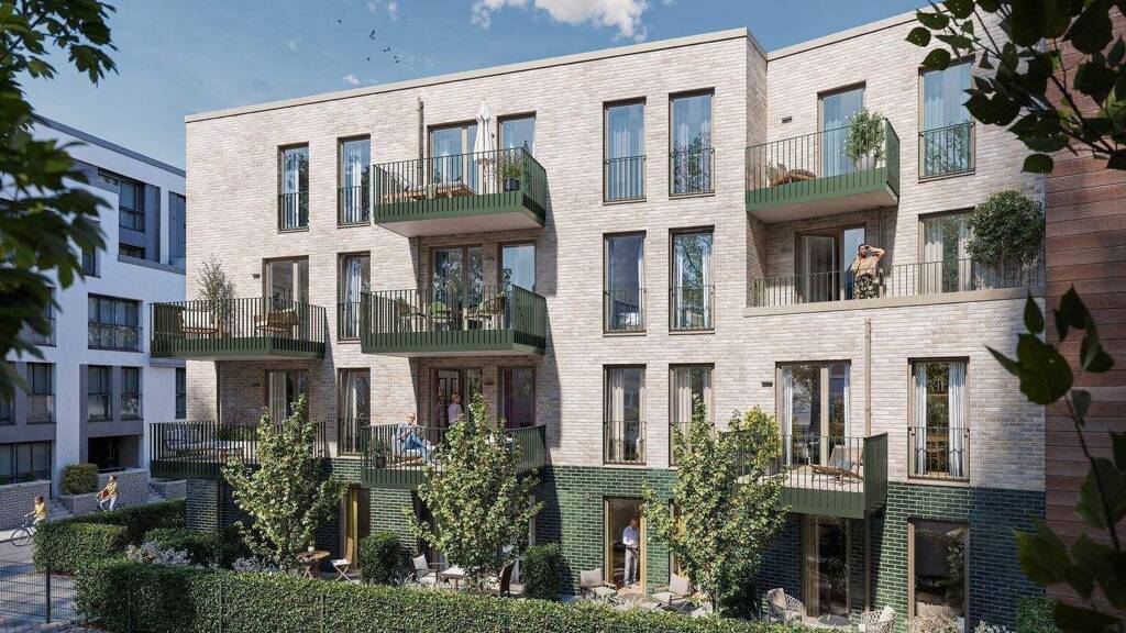 Sechs 1-Zimmer-Service-Appartements im Erdgeschoß, je drei Wohnungen im 1. und 2. OG sowie zwei Endetagenwohnungen: Die Bogenallee 8 bietet einer kleinen Eigentümergemeinschaft viel Raum zum Leben. Auch draußen! Zu den Appartements im Erdgeschoß gehören Terrassen, alle Wohnungen haben Balkone und die oberen Wohnungen bestechen durch große Dachterrassen. Hinzu kommen Gemeinschaftsflächen für alle. Kleine Rasenflächen mit Baumstämmen, Mulden, Hüpfpollern und Sitzbänken machen das Grundstück zu einer kleinen Oase, die durch grüne Hecken natürlich abgeschirmt wird. Ein grüner Blickfang ist übrigens der große „Haus-Baum“ im Bogen der Bogenallee. Außergewöhnliche Material- und Farbelemente verleihen der Fassade Charakter. Ein stockwerkhoher Sockel aus grün glasierten Steinen bildet einen ausdrucksstarken Kontrast zu den Holzpaneelen Im Eingangsbereich. Aus energetischen Gründen ist das Gebäude mit einem zweischaligen Mauerwerk aus Natursteinen mit einem außenliegenden beigen Verblendstein ausgeführt. Auch die Energieversorgung ist konsequent nachhaltig angelegt. Von der effizienten und umweltfreundlichen Fernwärmelösung bis zur Photovoltaikanlage auf dem Dach – das mit einer extensiven Begrünung bepflanzt wird. Die 3-fach verglasten Fenster haben eine Sonnenschutzverglasung und selbstverständlich hat jede Wohnung Glasfaseranschluss.