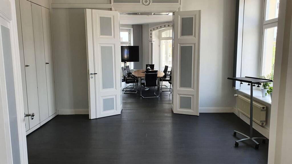 Außerdem gibt es noch einen tollen Raum (Büroraum 2), welcher auf 2 Seiten von Flügeltüren umgeben ist. In diesem Raum befindet sich ein Schreibtisch und ein Sofa. Gern können Sie bei Bedarf einen zweiten Schreibtisch in dem Raum nutzen.