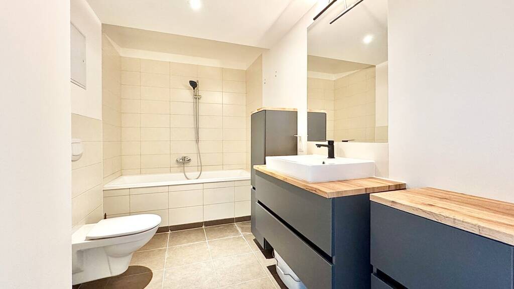* modern verfliestes Badezimmer mit Badewanne und WC