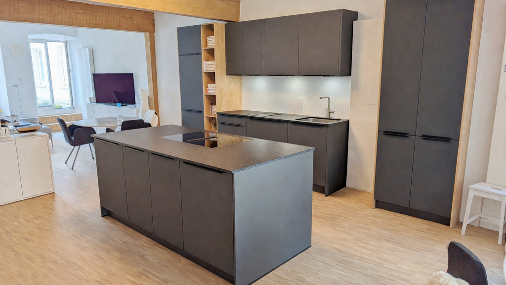 Die hochwertige, moderne Einbauküche in elegantem Schwarz fügt sich harmonisch in den offenen Wohnbereich ein und überzeugt sowohl optisch als auch funktional. Sie bietet ausreichend Arbeitsfläche lässt keine Wünsche offen. Angrenzend an den Wohnbereich befinden sich ein weiteres Zimmer, dass sich ideal als Kinder-, Gäste- oder Arbeitszimmer eignet.