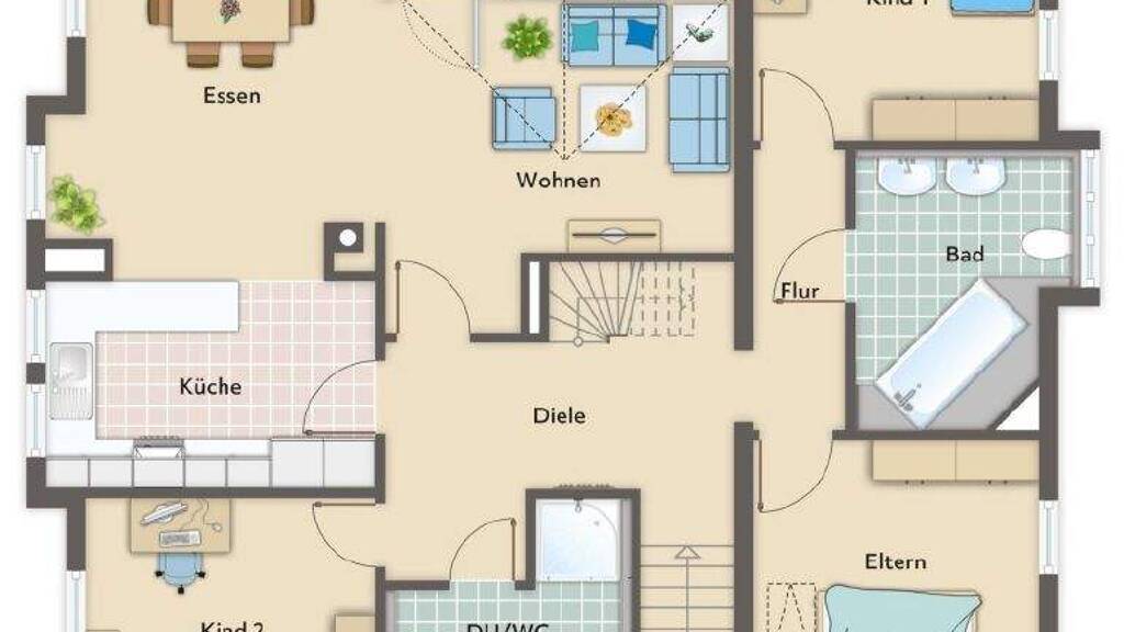 Im 1. Dachgeschoss befinden sich eine Diele, ein Flur, ein Schlafzimmer, zwei Kinderzimmer, zwei Tageslichtbäder, ein großzügiger offener Bereich mit Küche, Ess- und Wohnzimmer sowie ein Balkon. Der Balkon ist überdacht und zur Westseite ausgerichtet. Er bietet einen Blick über die Dächer und sonnige Stunden am Nachmittag und Abend.