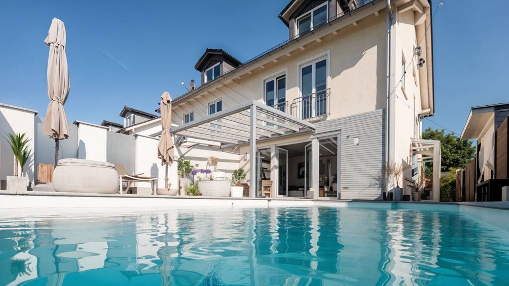 Der beheizbare Pool mit römischer Treppe und die stilvoll gestalteten Ruhebereiche verwandeln den Garten in eine private Resort-Landschaft - ein Statement für luxuriöses Wohnen. Technisch erfüllt die I mmobilie jeden Anspruch modernen Wohnens: KfW-40-Massivbau, effiziente Wärmepumpe, Dreifachverglasung, elektrische Rollläden, intelligente LED-Lichtszenen mit Zeitsteuerung, Kameraüberwachung sowie eine durchdachte Smart-Home-Infrastruktur sorgen für Komfort, Sicherheit und Nachhaltigkeit auf höchstem Niveau.