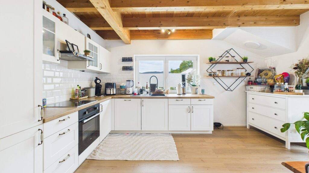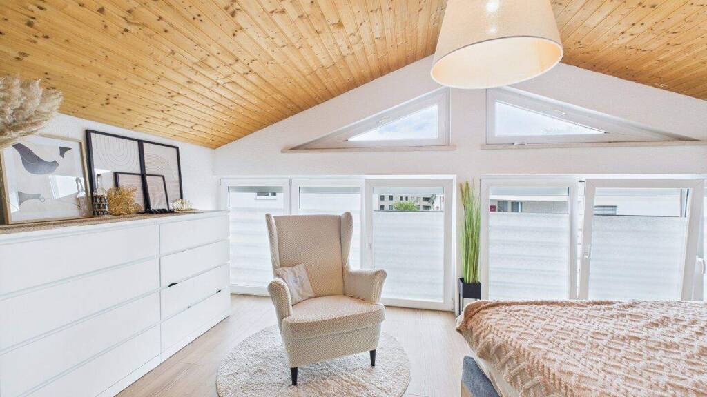 Besonders charmant sind die sichtbaren Holzbalken im Dachgeschoss, die dem Wohnbereich eine warme und einladende Atmosphäre verleihen.
