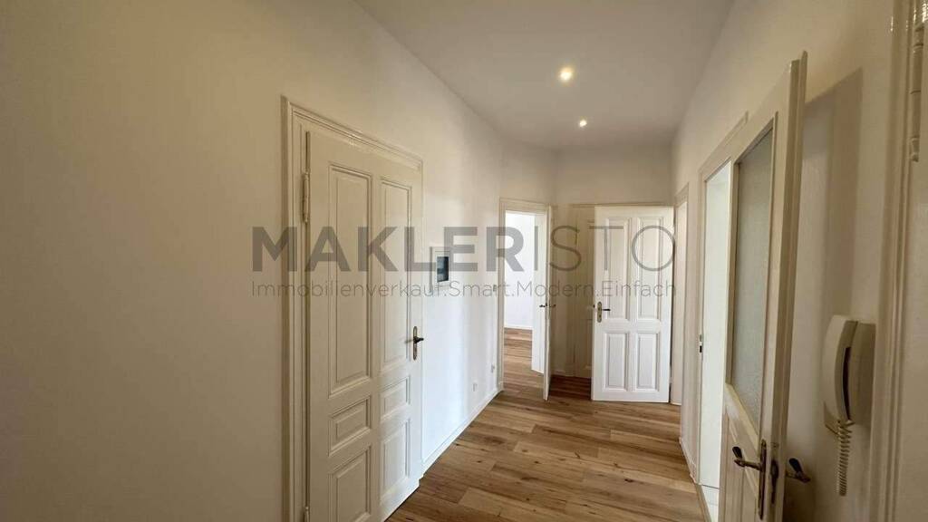 Dabei werden sämtliche Fußböden erneuert und die Wände nach modernstem Standard gespachtelt. Das Wohn- und Schlafzimmer sowie der Flur erhalten einen hochwertigen Fußbodenbelag mit exklusiven Holzdielen im Landhausstil. In Bad und Küche werden moderne Fliesen verlegt, während das innenliegende Badezimmer mit einer Badewanne sowie einer Dusche, einem Handtuchheizkörper und einen Waschmaschinenanschluss ausgestattet ist. Deckenspots wurden im Flur, Bad und in der offenen Küche integriert.