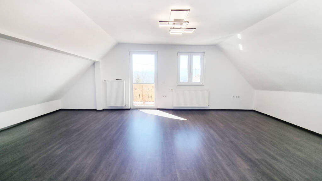 + Zimmer (29,67?m²): Großes, helles Schlafzimmer mit Balkonzugang und schöner Aussicht auf die Umgebung und den Wörthersee.