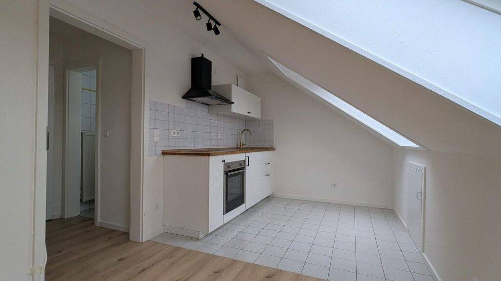 Besonderer Wert wurde bei der Renovierung auf ein helles, freundliches Wohnkonzept im skandinavischen Stil gelegt. Durch die großen Dachflächenfenster fällt sehr viel Tageslicht in den Raum. Der neu verlegte, hochwertige Boden in heller Eichenoptik sorgt in Kombination mit den weißen Wänden für eine warme und moderne Atmosphäre.
