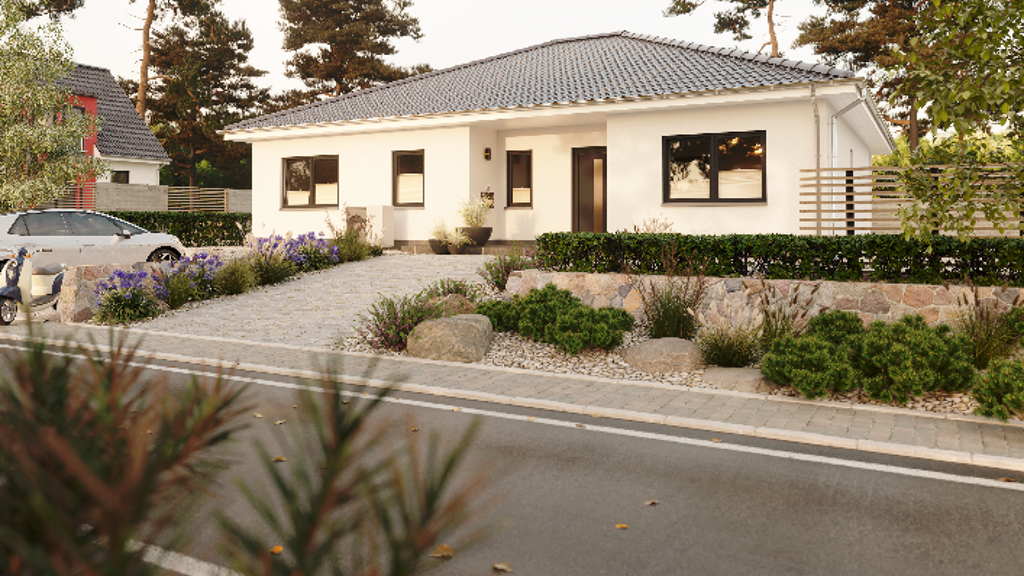 Ein Bungalow, der begeistert - Ein Bungalow, der es - im wahrsten Sinne des Wortes - in sich hat: viel Platz, keine Stufen, zwei Bäder und vieles mehr finden Sie im Bungalow 128. Dank der klugen Raumaufteilung kann der Bereich neben dem Eingang als Einliegerwohnung genutzt werden. Je nach Wunsch oder Lebensphase können Sie diese als abgeschlossenen Arbeitsbereich nutzen oder als Wohnung mit separatem Eingang vermieten.