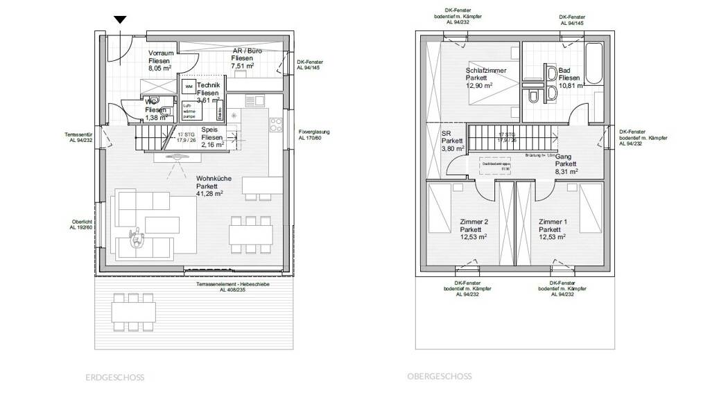 Erdgeschoss: groĂźes Wohn- und Esszimmer mit offener KĂĽche, Speis, BĂĽro, Technikraum, WC, Vorraum