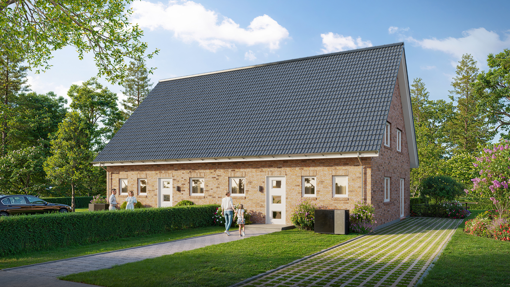 Details zum Haus: Es handelt sich um ein Neubau-Doppelhaus in Massivbauweise mit klassischem Satteldach, geplant nach den Vorgaben des Gebäudeenergiegesetzes (GEG). Je Wohneinheit erstrecken sich zwei Ebenen mit Wohnen/Essen im Erdgeschoss und drei Schlafräumen im Dachgeschoss; moderne Haustechnik wie Luft-Wasser-Wärmepumpe, kontrollierte Be-/Entlüftung und 3-fach-Verglasung ist vorgesehen. -Familienfreundlicher Grundriss mit klaren Zonen (Wohnen unten, Schlafen oben) -Moderne Haustechnik: Luft-Wasser-Wärmepumpe, kontrollierte Be-/Entlüftung -3-fach verglaste Fenster und durchgängige Fußbodenheizung -Niedriger Energiebedarf - effizienter Neubau nach GEG -Terrasse und Stellplatz am Haus -Qualitätsnachweis durch Blower-Door-Test -Bezugsfreundliche Planung: kurze Wege, funktionale Räume, viel Tageslicht