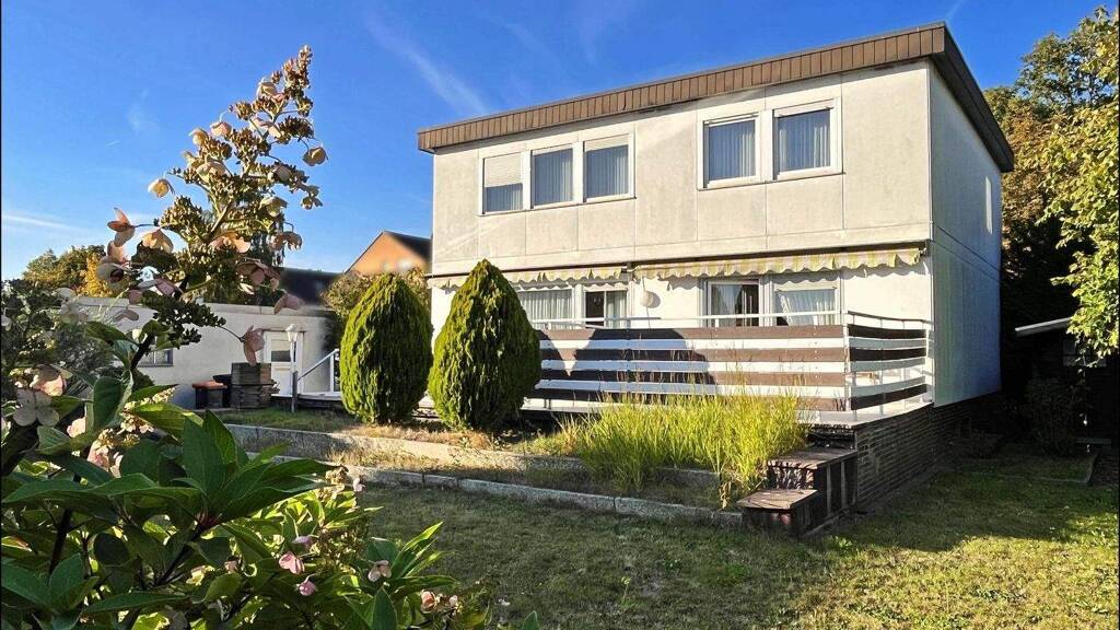Ausstattungsmerkmale im Überblick . Baujahr 1973, Fertigbauweise . Zwei Vollgeschosse mit Flachdach . Ca. 152 m² Wohnfläche auf 7,5 Zimmern . Vollkeller mit zusätzlichem Tageslichtbad . Großes, lichtdurchflutetes Wohn- und Esszimmer . Zwei Badezimmer + Gäste-WC . Südterrasse und sonniges Grundstück (ca. 521 m²) . Fernwärmeanschluss (energieeffizient & zukunftssicher) . Teilweise erneuerte Fenster . Garage mit direktem Zugang vom Garten . Ruhige Lage in gewachsenem Wohngebiet von Hamm-Heessen . Sehr gute Infrastruktur und ÖPNV-Anbindung