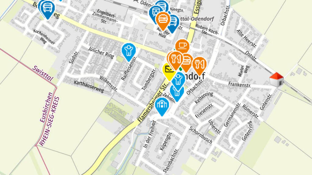 Das Grundstück liegt in einer ruhigen Wohnsiedlung von Odendorf und ist ca. 100 m vom Ortszentrum und ca. fünf Gehminuten vom Bahnhof entfernt. Hier haben Sie alles in Reichweite, was Sie brauchen: Nahversorgung, Kindergärten, Grundschule, Ärzte usw. Aber auch die schönen Städtchen Rheinbach und Euskirchen sind nur ca. 7 und 9 km entfernt und laden zum entspannten Bummeln ein. Swisttal ist ein Gemeindeverbund mit derzeit ca. 19.515 von Köln zwischen dem Naturpark Kottenforst-Ville und der Zülpicher Börde. Einer von insgesamt zehn Orten im Gemeindeverbund ist Odendorf. Weitläufige Felder und Wiesen mit zahlreichen Rad-, Reit- und Wanderwegen liegen direkt vor der Haustür und laden entlang von Burgen (WasserburgenRoute) und alten Kirchen zu ausgedehnten Spaziergängen und sportlichen Aktivitäten ein. Das Naherholungsgebiet Steinbachtalsperre ist bequem mit dem Rad erreichbar und wird insbesondere im Sommer zukünftig wieder ein lohnenswertes Ziel auch für Badegäste sein. Hier in Odendorf finden Sie gelebtes Brauchtum sowie ein beachtliches Sport-, Freizeit- und Kulturangebot. Die Städte Rheinbach, Euskirchen und Bonn sind mit der Bahn und dem Bus erreichbar. Ein Anschluss an die A61 ist wenige Fahrminuten entfernt.