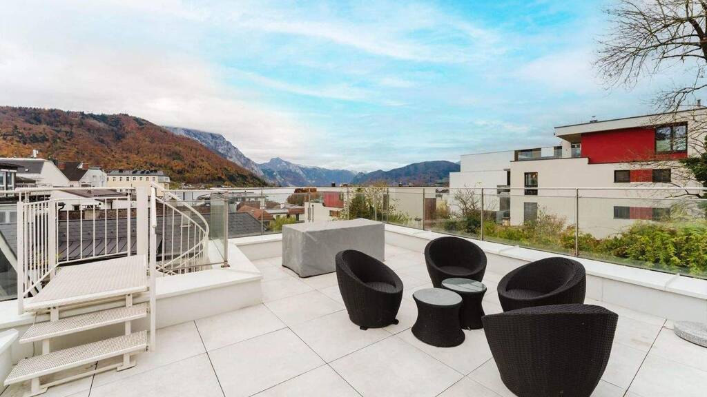 TRÄUMEN - Ein Buch in der Hand am wärmenden Kaminfeuer, den Blick schweifend auf den "Wächter des Salzkammergutes" - im Wohnzimmer bleibt dies kein Traum. Zusätzlich sind mit der schlafenden Griechin und partiellem Seeblick weitere regionale Attraktionen sichtbar. Ein Genuss für das Auge und die Seele. Westlich begleitet den offen gestalteten Wohnbereich bzw. das Wohnzimmer eine üppige Bepflanzung mit sattem Grün. Anschließend, Richtung Süden, befindet sich der Balkon mit der Wendeltreppe auf die Dachterrasse - eine weitere Besonderheit dieser Immobilie - hervorragend geeignet als Grillplatz und selbstverständlich mit Blick auf den See und die umliegende Gebirgslandschaft - inkl. Traunstein.