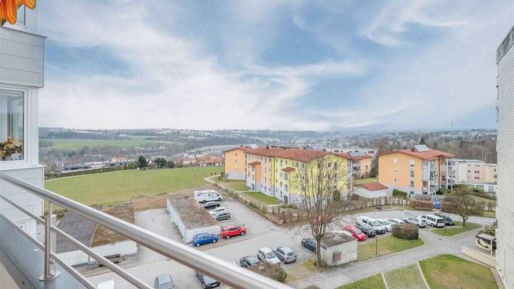Ein Traumblick wie vom Adlerhorst, sie schauen bis zum Passauer Dom St. Stephan. Vom Balkon aus schweift der Blick ungehindert über die Dächer. Besonders abends, wenn die Stadt beleuchtet ist wird dieser Ausblick zum täglichen Highlight. Der Balkon direkt am Wohnzimmer hat Platz für einen kleinen Tisch, zwei Stühle und Pflanzen.