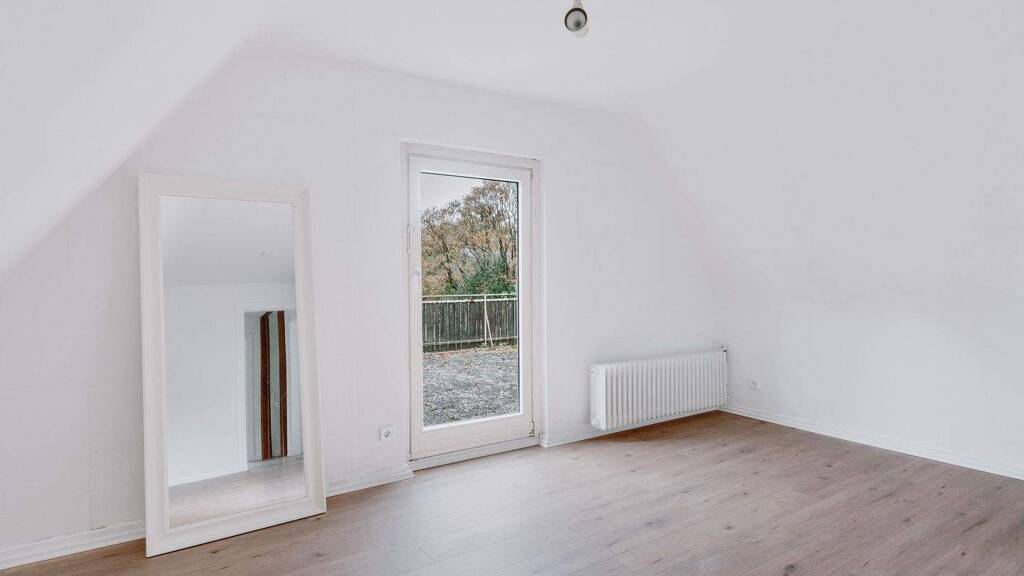 Im Obergeschoss erwarten Sie ein stilvoll saniertes Badezimmer mit modernen Fliesen sowie drei weitere Zimmer: ein kleineres Zimmer, ideal als Kinder- oder Arbeitszimmer nutzbar, ein großzügiges Schlafzimmer mit direktem Zugang zur großzügigen Dachterrasse sowie ein weiteres, großes Zimmer mit bodentiefer Glasfront und herrlichem Blick in den Garten. Auch hier wurde ein Designboden verlegt. Viele Fenster sorgen auch hier für viel Tageslicht und eine freundliche Wohnatmosphäre.
