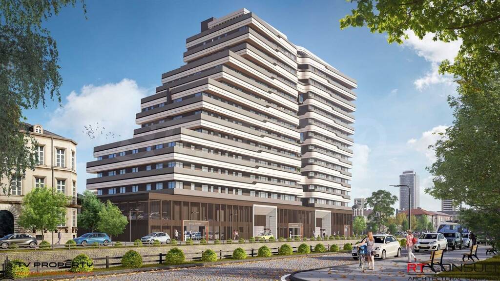 Im obersten 14. Stock befindet sich eine Mehrzimmerwohnung mit privater Dachterrasse, die einen Panoramablick ĂĽber die Stadt bietet.