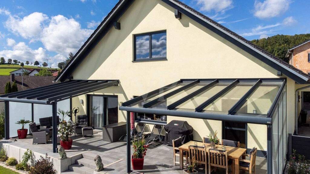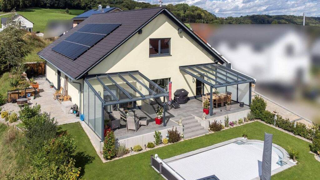 Der Außenbereich ist ebenso attraktiv gestaltet. Eine große Südterrasse mit zwei Überdachungen sowie Sonnen- und Windschotts ermöglicht eine ganzjährige Nutzung und lädt zum Verweilen im Freien ein. Der angrenzende Pool verspricht Erfrischung an warmen Tagen und macht das pflegeleichte, großzügige Grundstück zu einem besonderen Rückzugsort.