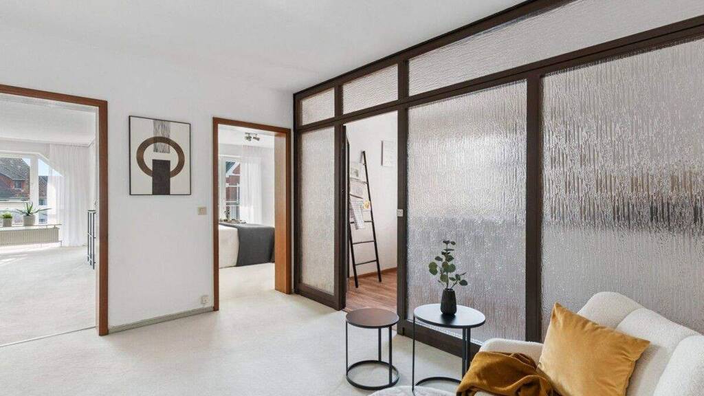 Zur rechten Seite befindet sich die helle Küche, die sich durch eine Glasabtrennung zum Flur hin öffnet. Hier lässt sich problemlos eine gemütliche Essecke integrieren. Perfekt für ein entspanntes Frühstück am Morgen.