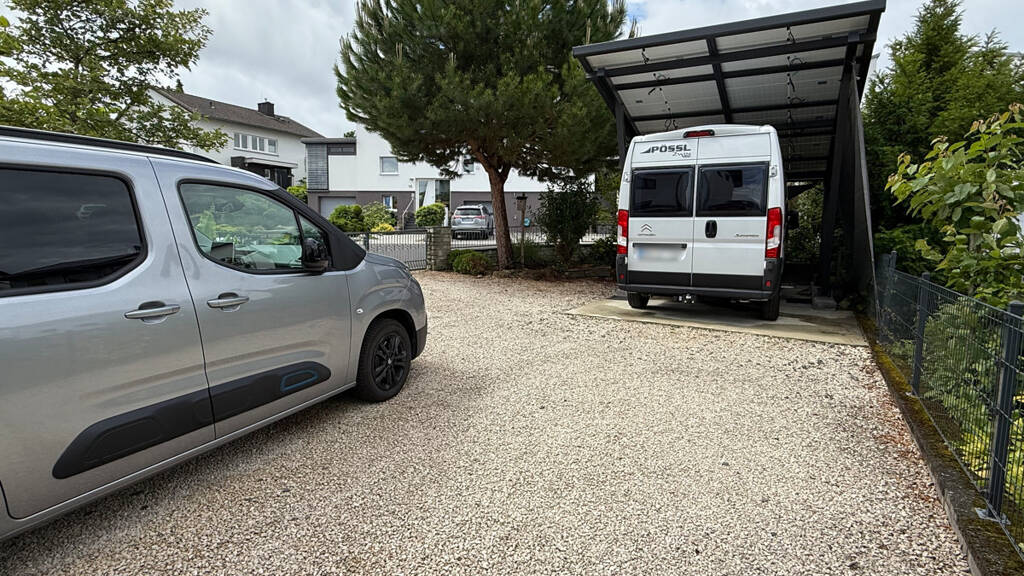 Der Vorgarten hält zudem noch eine Garage, einen Solar-Carport (4 kWp) und ein bis zwei Pkw-Außenstellplätze bereit.