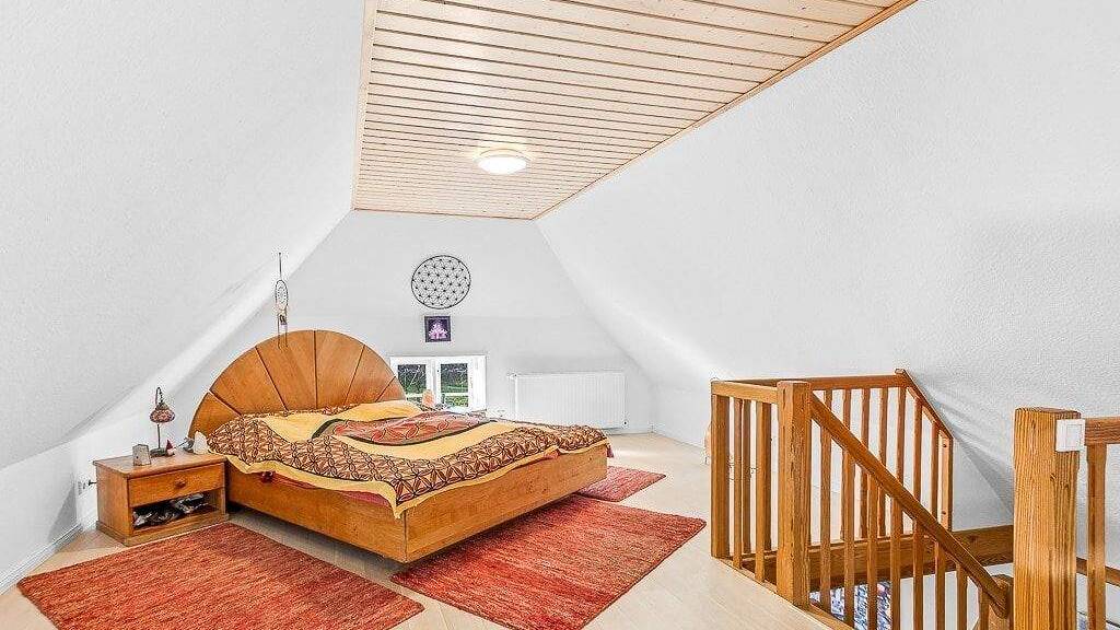 Zum ausgebauten Dachgeschoss mit ca. 45 m² Wohnfläche gelangen Sie über eine Holztreppe vom Esszimmer aus. Dort erwarten Sie das großzügige Schlafzimmer mit einem gemütlichen Loungebereich. Die helle Wandgestaltung, der warme Parkettboden und die Holzvertäfelung an der Decke machen dieses Zimmer zu einem schönen Plätzchen für die Ruhephase. Ein Einbauschrank und ein separates Ankleidezimmer sind ebenfalls auf dieser Ebene zu finden.