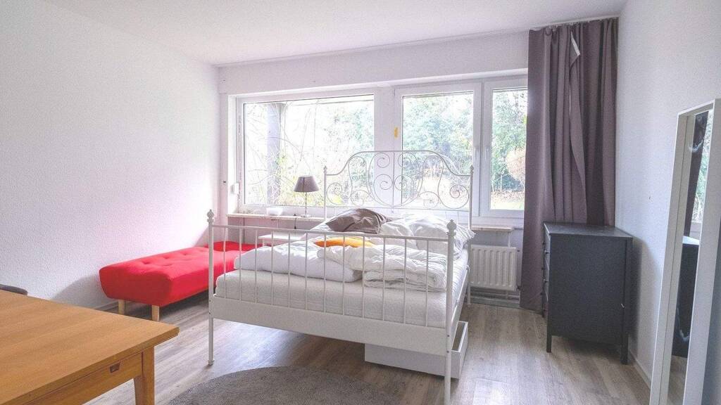 Sie besitzt einen direkten Zugang zum Garten, über die eigene Terrasse. Vor dem Haus sind 40 hauseigene Stellplätze, die nur von Anwohnern genutzt werden.