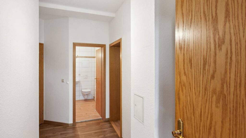 Eine der 3-Zimmer-Wohnungen wurde nach dem Auszug des Vormieters renoviert, mit neuem Fußboden ausgestattet und das Bad modernisiert sowie neu gefliest. Das Bad, die Küche, das Schlafzimmer und das Wohnzimmer sind vom Flur aus erreichbar, während das Kinderzimmer von der Küche aus zugänglich ist. Vom Wohnzimmer aus hat man einen unverbauten Blick ins Erzgebirge.