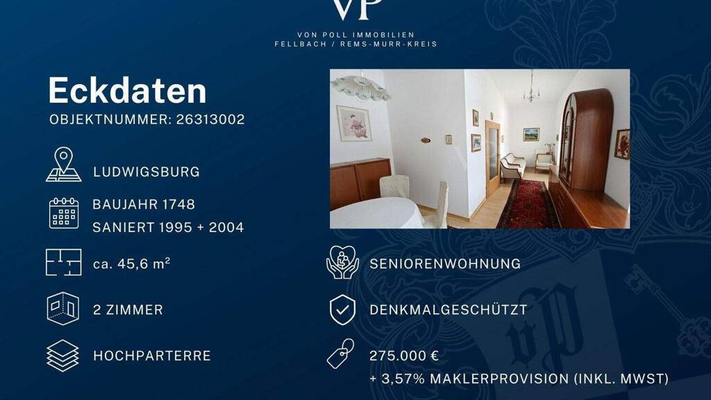 Sie möchten im Alter in einem gepflegten und stilvollen Umfeld mit Hotelcharakter in gehobener Kategorie möglichst sorgenfrei eigenverantwortlich leben und auch die Möglichkeit haben, später eine vollstationäre Pflege in Anspruch nehmen zu können, dann bieten wir Ihnen im MC-Seniorenstift Ludwigsburg dieses gepflegte 2-Zimmer Apartment mit einer Wohnfläche von ca. 45,61 m² zum Kauf an. Es ist unterteilt in ein helles Wohnzimmer mit Essbereich und Austritt zum überdachten Balkon mit Blick ins Grüne und einem geräumigen Schlafzimmer. Hier lässt sich auch ein Schreibtisch stellen.