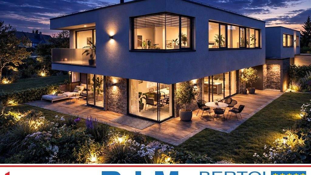 Der moderne, anmutige Kubus schafft mit Sockelgeschossen aus Naturstein, weiß verputzen Obergeschossen und Holz-verschaltem Nebengebäude ein harmonisches Zusammenspiel natürlicher, perfekt aufeinander abgestimmter, hochwertiger Materialien.
