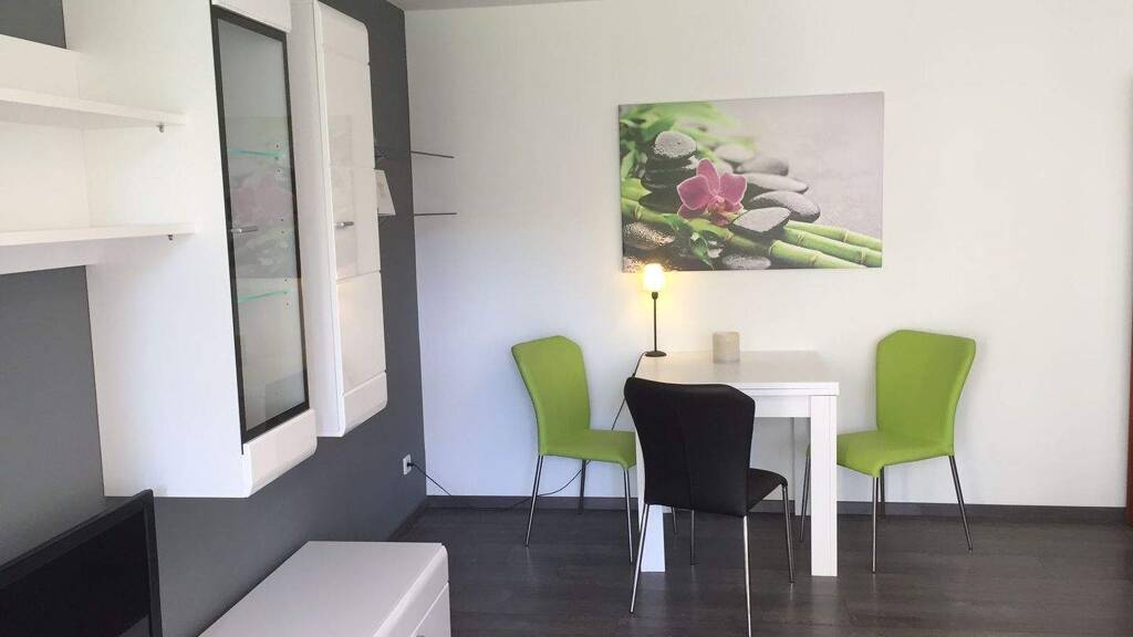 Das Schlafzimmer sowie das Wohnzimmer sind mit hochwertigem grauem Laminatboden ausgestattet, während Flur, Küche und Badezimmer mit modernen schwarzen Bodenfliesen versehen sind. Weiße Kunststofffenster sorgen in allen Räumen für eine helle und freundliche Atmosphäre und eröffnen einen angenehmen Blick ins Grüne. Die Wohnung ist barrierefrei zugänglich.