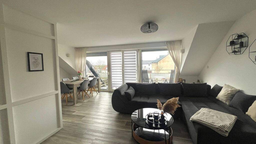Die Wohnung bietet ein großzügiges Wohnzimmer mit offener Einbauküche. Ein zusätzlicher Spitzboden steht als praktische Nutzfläche zur Verfügung und eignet sich ideal zum Abstellen oder Lagern.