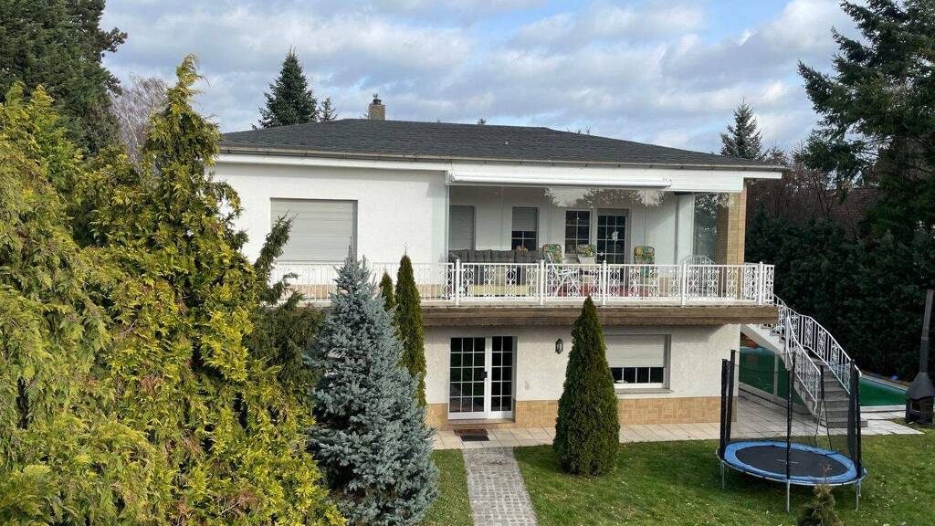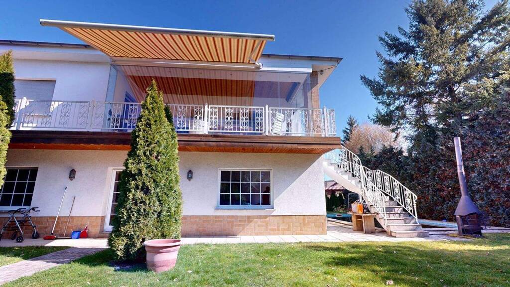 Das 2005 errichtete Haus bietet mit vier Zimmern, zwei Badezimmern, einem umlaufenden Balkon sowie einer großzügigen Garage viel Raum zum Wohlfühlen. Auf zwei Etagen verteilt sich eine angenehme Raumstruktur mit behaglicher Atmosphäre. Der große Balkon zieht sich elegant über zwei Seiten des Hauses und verbindet das Obergeschoss über eine geschwungene Außentreppe direkt mit dem Garten.