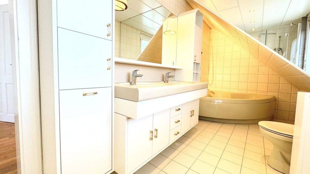 Mit rund 200m² Wohnfläche sowie etwa 100m² Keller bietet das Haus viel Raum für individuelles Wohnen und Entfalten. Die Raumaufteilung ist ebenso durchdacht wie einladend. Im Erdgeschoss empfängt Sie ein stilvolles Entrée, das sanft in den Vorraum übergeht. Von hier aus öffnen sich die Türen zum großzügigen Wohn- und Esszimmer, dessen Ofen eine behagliche Wärme ausstrahlt und zum Verweilen einlädt. Ergänzt wird diese Ebene durch einen separaten Garderobenraum, eine gemütliche Küche mit Essecke sowie ein WC.