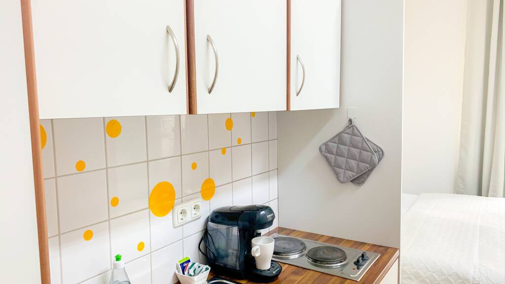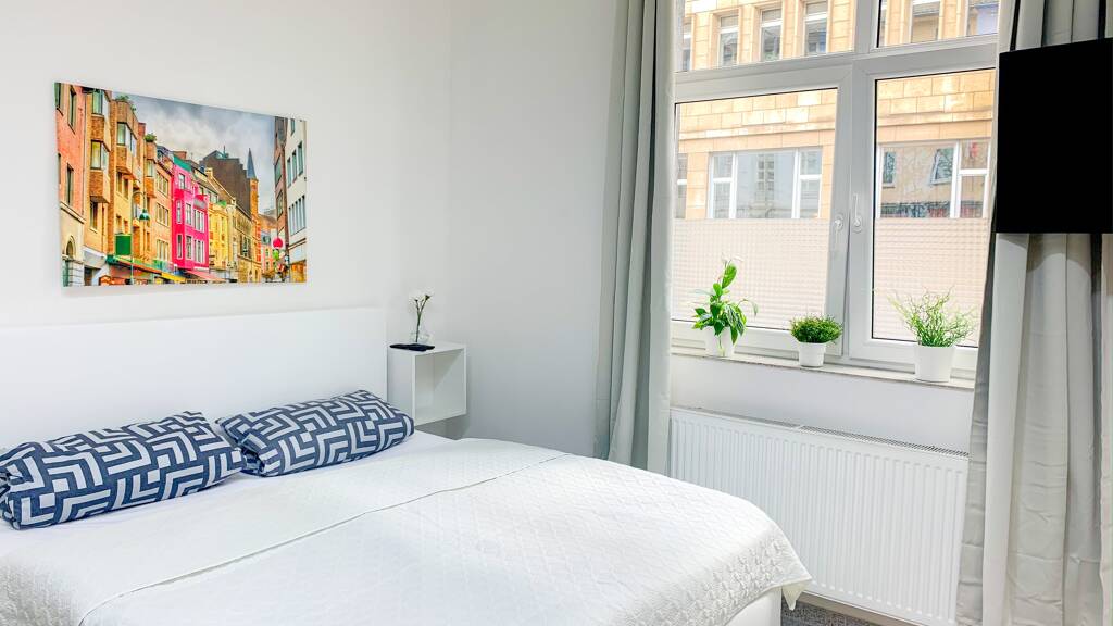 A modern and comfortably furnished apartment is available for rent opposite Aachen Central Station. The apartment is stylishly furnished with box-spring beds, high-quality bedding and a dining/desk. In addition to a refrigerator with a 2-star cooling compartment and glass ceramic hob, the pantry kitchen includes a Nespresso machine and a very extensive range of kitchen equipment. A flat screen TV with streaming services is available for watching TV.