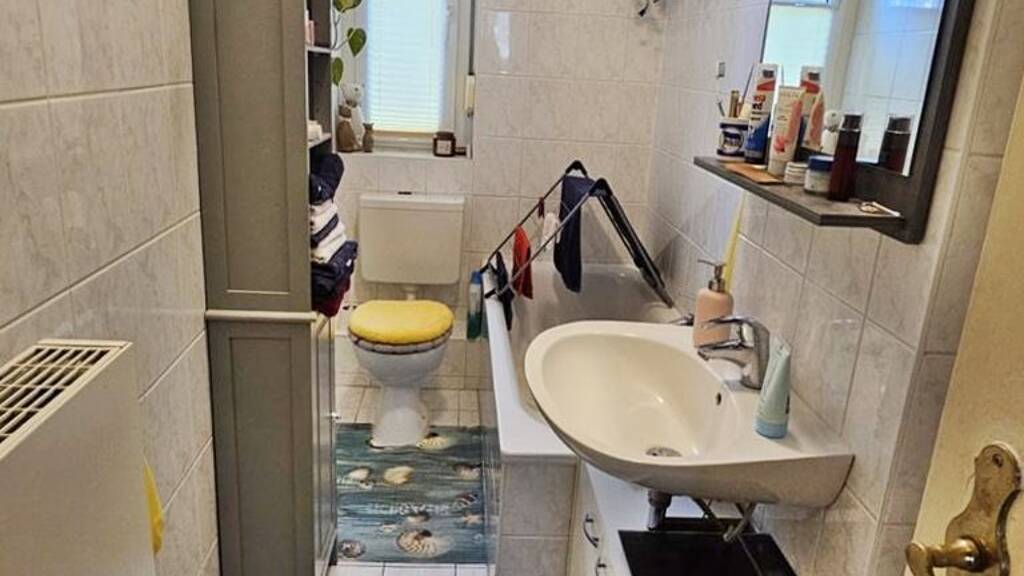 Das Tageslichtbad ist praktisch angelegt, mit zeitlosen, weiß-grauen Fliesen ausgestattet und verfügt über eine Badewanne.