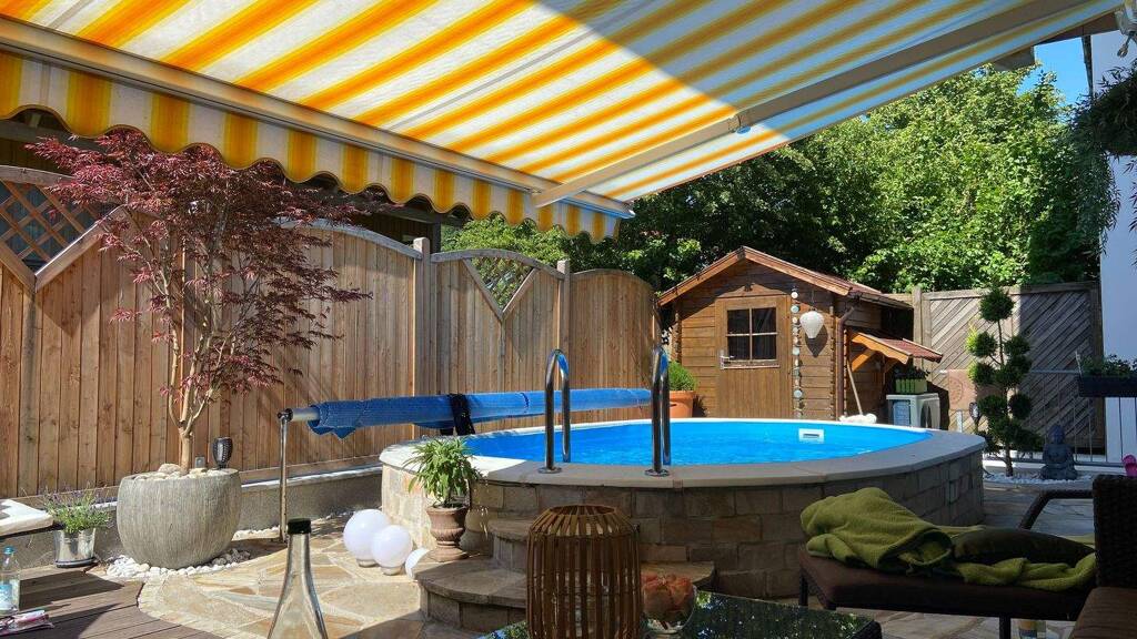 Richtig neidisch werden Ihre Gäste beim betrachten des nur von Ihnen nutzbaren Gartens (im Plan rot) werden. Wer nennt schon einen mit Wärmepumpe beheizten Pool mit Gegenstromanlage sein eigen? Ein Gartenhäuschen sowie ein zusätzlicher Freisitz mit Grillplatz vervollständigen die Gartenausstattung.