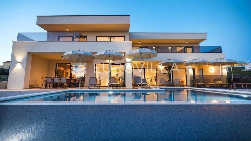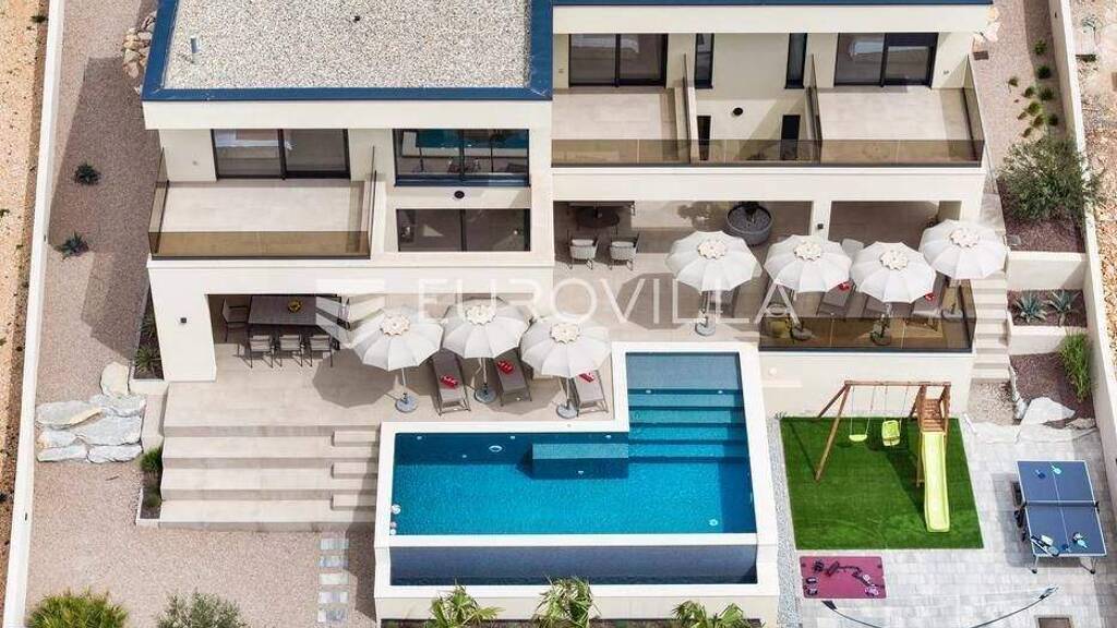 Zadar, Maslenica - Luksuzna vila s bazenom i neometanim pogledom na Novigradsko more 254 m2Vila je izgradena na zemljistu povrsine 654 m2 i nudi ocaravajuci pogled na more. Izgradena je 2024. godine, kompletno uredena i opremljena, spremna za useljenje.Samim ulaskom u vilu dolazimo od prizemlja u kojem se nalazi hodnik, kupaonica, praonica rublja, spavaca soba, kuhinja s blagovaonicom i dnevnim boravkom direktnim izlazom na terasu s bazenom.Unutarnje stepenice vode na prvi kat gdje se nalaze hodnik i tri spavace sobe, svaka s vlastitom kupaonicom i dijelom natkrivenim terasama.U dvoristu se nalazi spremiste i 4 parkiralisna mjesta. Dvoriste je lijepo uredeno s bazenom i ugradenim jacuzzijem od 40 m2, suncalistem (strojarnicom) i prostorom za rekreaciju.Ukupna povrsina vile iznosi 254 m2, od mora je udaljena svega 620 m, a od centra Maslenice 1 km.Prilikom samog projektiranja i gradenja vodilo se racuna o vrhunskoj kvaliteti same izvedbe kao i odabiru najkvalitetnijih materijala. Termoizolacija fasade, plocice vrhunske kvalitete, aluminijska stolarija s elektricnim roletama, klima uredaji i podno grijanje samo su neke od znacajki ove vile. Energetski certifikat vile je A.Maslenica se smjestila u dubokom prirodnom zaljevu - Novigradskom moru, nedaleko od usca rijeke Zrmanje koja se ulijeva u ovaj zaljev. Ime je dobila po stoljetnim maslinicima koji se i danas njeguju i uzgajaju uz samu obalu. Zapadno od Maslenice nalazi se impozantan Maslenicki most koji povezuje kontinentalnu Hrvatsku s Dalmacijom.Idealna za obiteljski odmor u prekrasnom prirodnom ambijentu cistog mora, bistre rijeke Zrmanje i impozantne planine Velebit.Dodatno za vise informacija stojimo na raspolaganju.... Vise na eurovilla.hr, ID: 439603