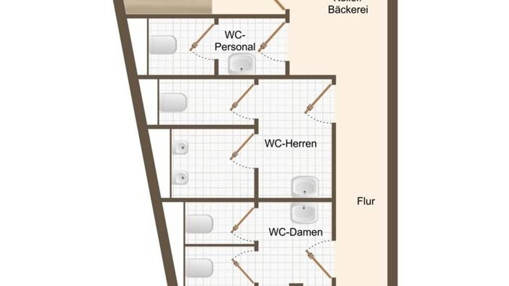 Zu den gewerblichen Räumen gehören zudem ein Küchenbereich sowie im Keller zwei Lagerräume und WC-Anlagen.